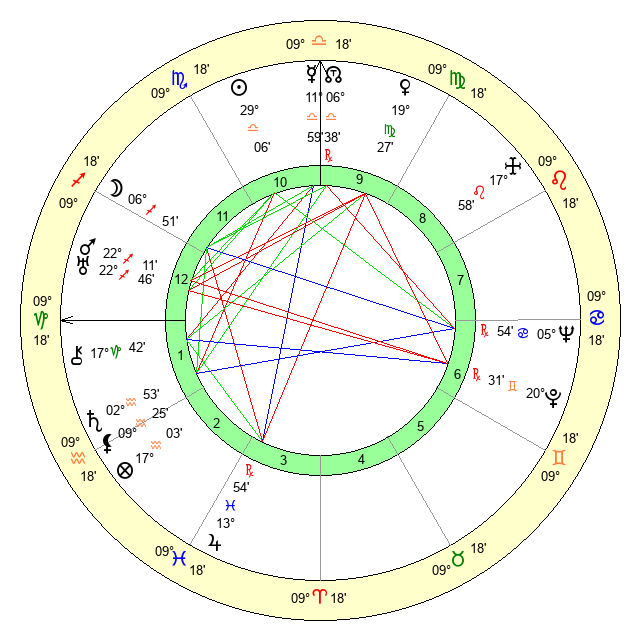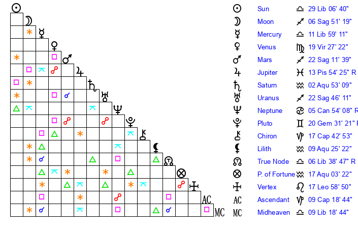 | Sun | 29 Libra 6 | 0 Scorpio 32 | 2 Pisces 40 |