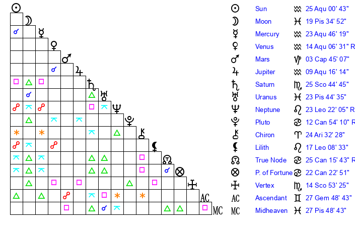 | Sun | 25 Aquarius 1 | 26 Aquarius 0 | 2 Gemini 31 |