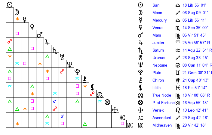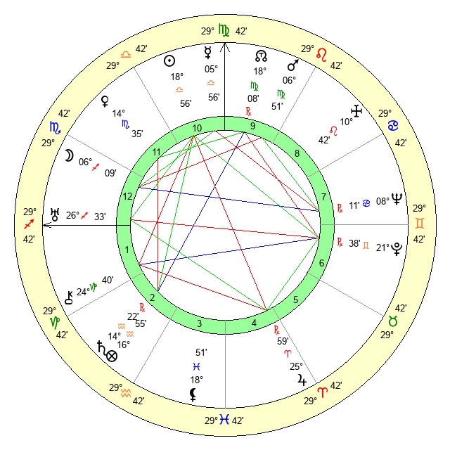 | Mars | 6 Virgo 52 | 13 Scorpio 55 | 12 Scorpio 49 |