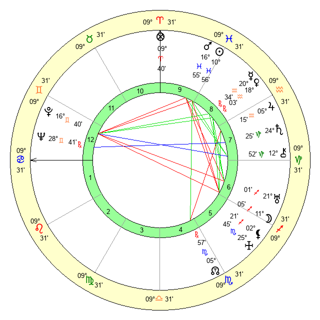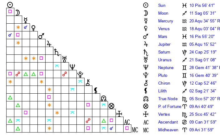 | Sun | 10 Pisces 56 | 12 Pisces 7 | 10 Cancer 33 |