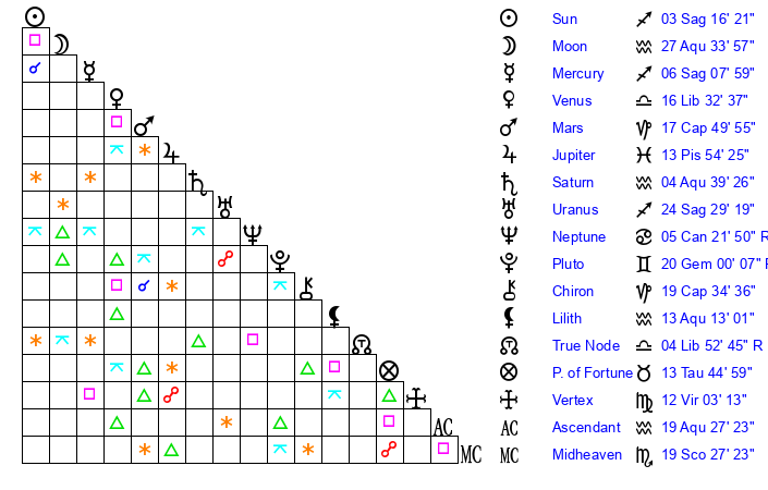 | Moon | 27 Aquarius 39 | 15 Aquarius 58 | 13 Leo 55 |