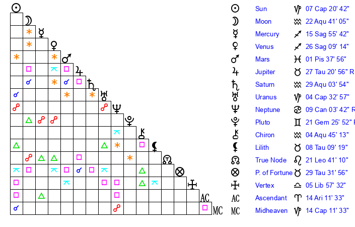 | Saturn | 29 Aquarius 30 | 25 Pisces 57 | 12 Pisces 45 |