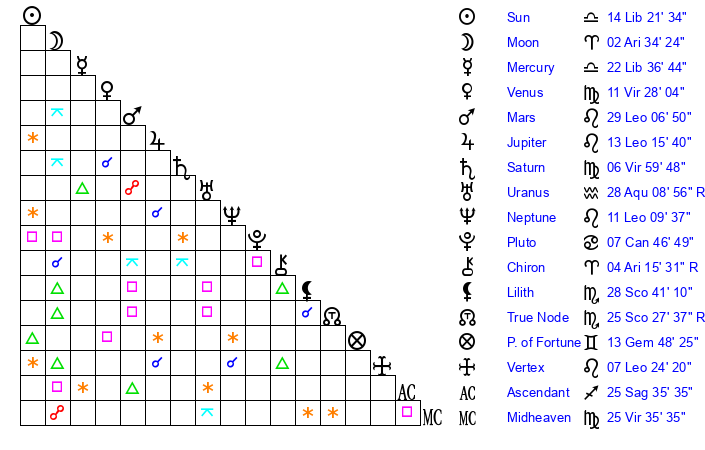 | Sun | 14 Libra 21 | 15 Libra 40 | 1 Aquarius 23 |