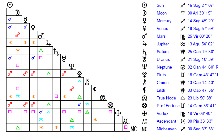 | Sun | 16 Sagittarius 27 | 17 Sagittarius 37 | 20 Aries 23 |