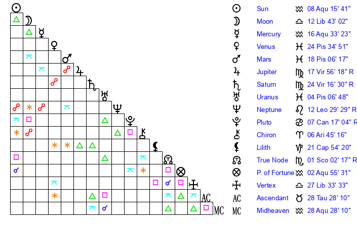 | Saturn | 25 Virgo 0 | 17 Pisces 0 | 18 Virgo 45 |