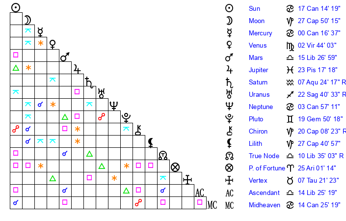 | Moon | 27 Capricorn 50 | 16 Capricorn 59 | 14 Cancer 7 |