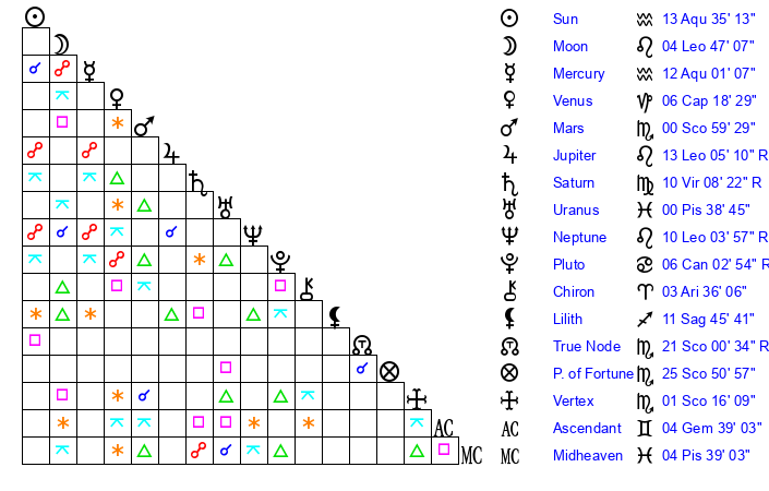 | Neptune | 10 Leo 3 | 28 Pisces 2 | 8 Leo 58 |