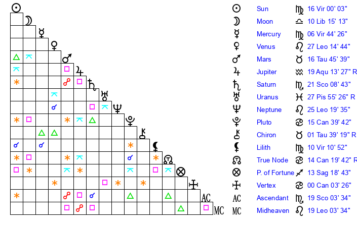 | Sun | 16 Virgo 0 | 17 Virgo 1 | 24 Sagittarius 46 |