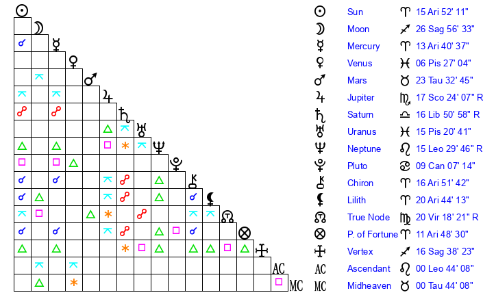 | Moon | 26 Sagittarius 57 | 6 Leo 44 | 10 Virgo 17 |