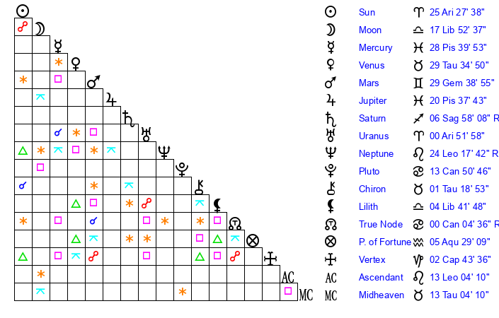 | Moon | 17 Libra 52 | 4 Sagittarius 6 | 23 Taurus 40 |
