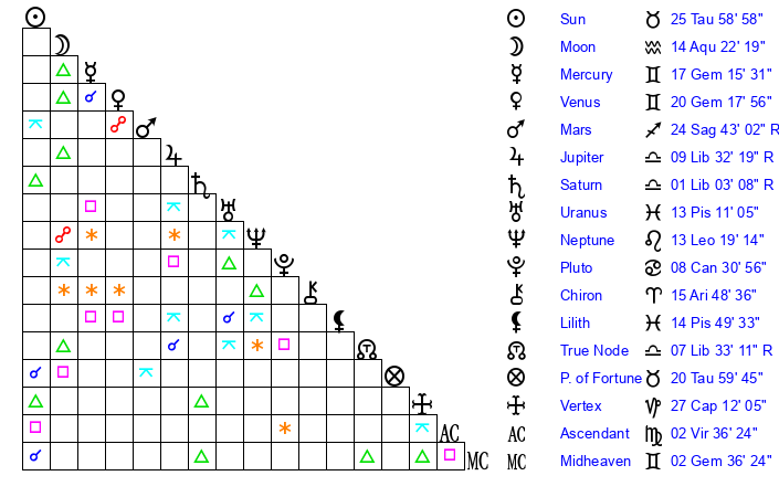 | Uranus | 13 Pisces 10 | 27 Taurus 18 | 11 Pisces 53 |