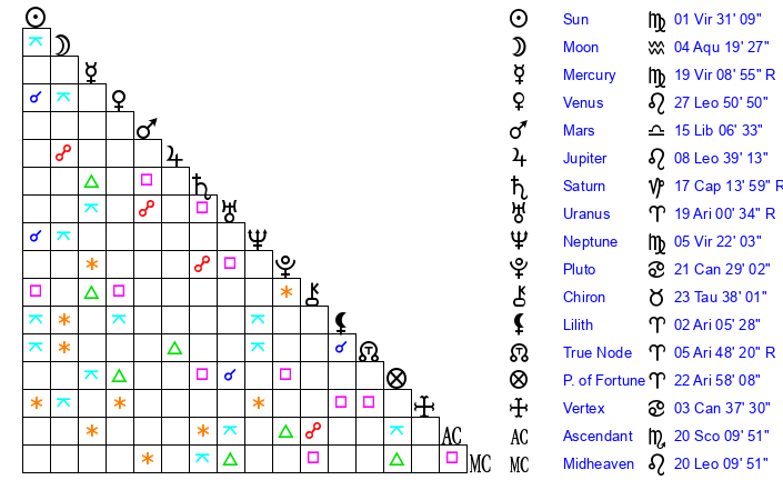 | Neptune | 5 Virgo 22 | 1 Aries 30 | 7 Virgo 56 |
