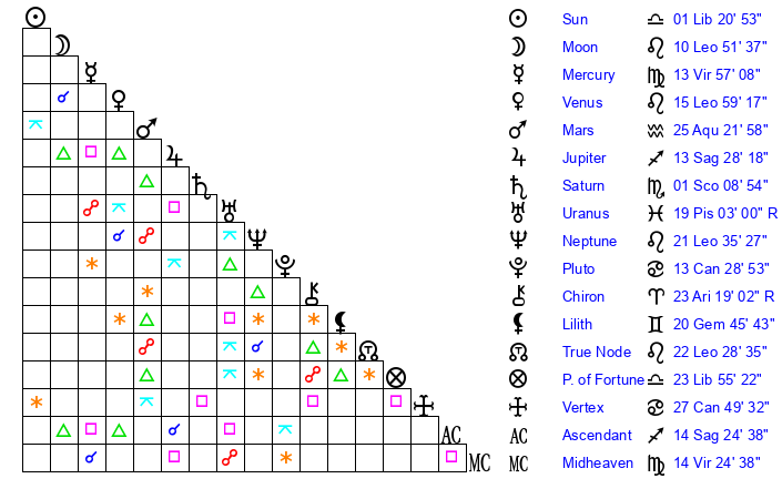 | Venus | 16 Leo 0 | 6 Virgo 20 | 16 Sagittarius 1 |