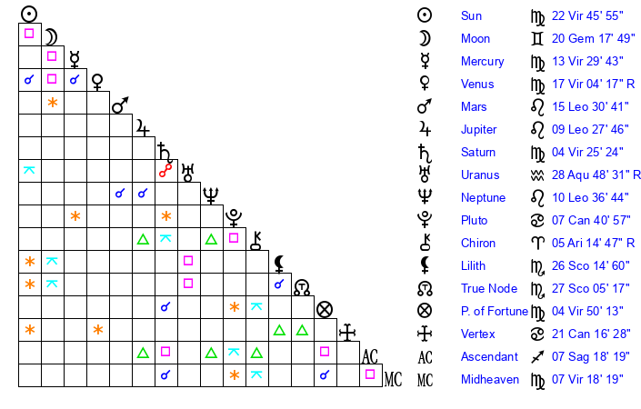 | Saturn | 5 Virgo 4 | 28 Pisces 44 | 12 Virgo 21 |