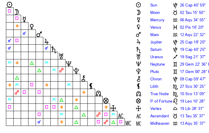 | Moon | 2 Taurus 24 | 12 Virgo 30 | 9 Scorpio 36 |