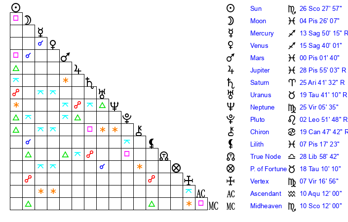 | Mars | 0 Pisces 1 | 10 Sagittarius 59 | 27 Aries 42 |