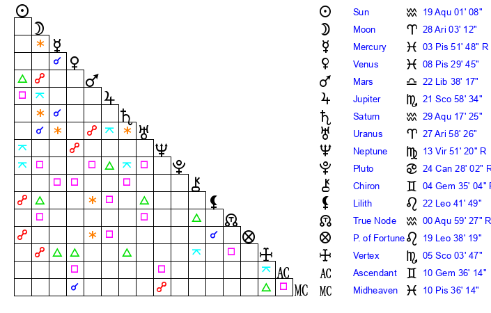 | Saturn | 29 Aquarius 25 | 18 Pisces 13 | 8 Pisces 52 |