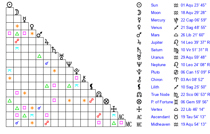 | Sun | 1 Aquarius 23 | 2 Aquarius 56 | 15 Taurus 50 |