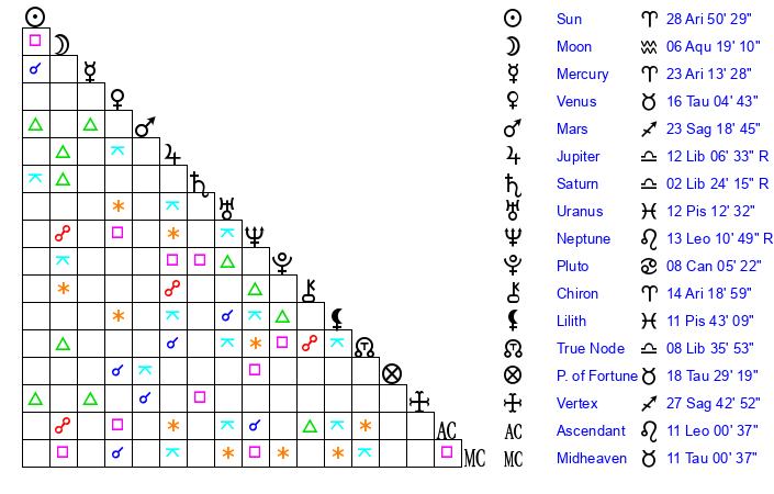 | Sun | 28 Aries 51 | 29 Aries 53 | 7 Leo 40 |