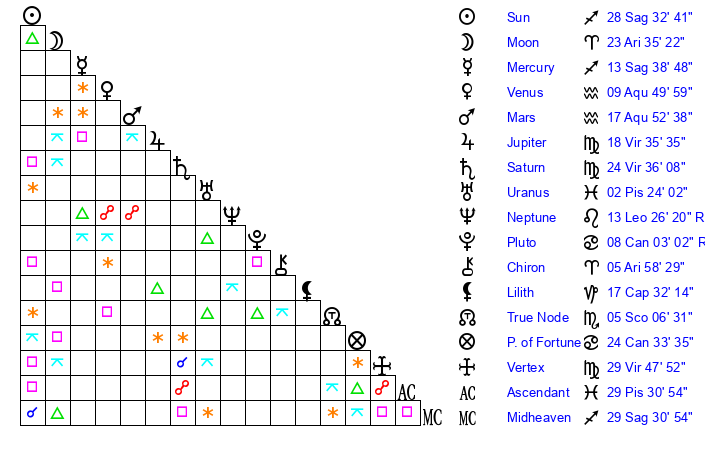 | Sun | 28 Sagittarius 32 | 29 Sagittarius 4 | 14 Aries 23 |