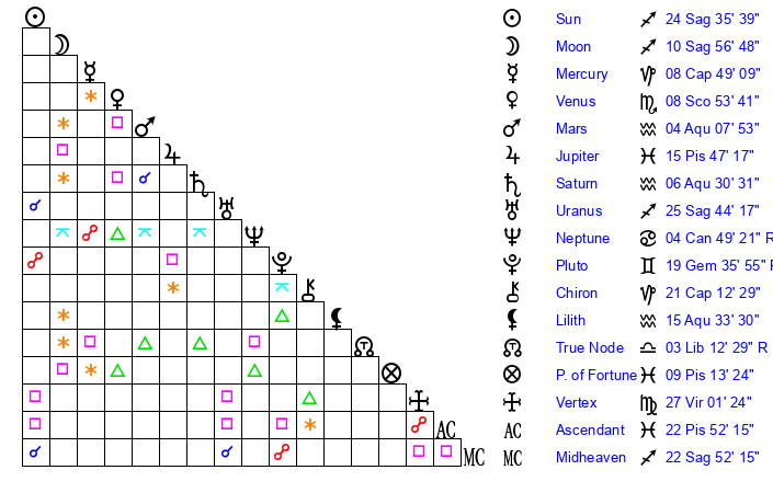 | Sun | 24 Sagittarius 36 | 26 Sagittarius 0 | 27 Aries 14 |
