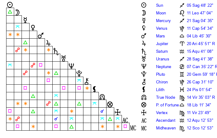 | Sun | 5 Sagittarius 49 | 6 Sagittarius 28 | 8 Aries 5 |
