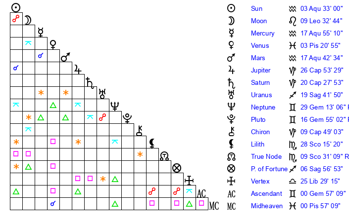 | Moon | 9 Leo 37 | 3 Sagittarius 10 | 29 Capricorn 59 |