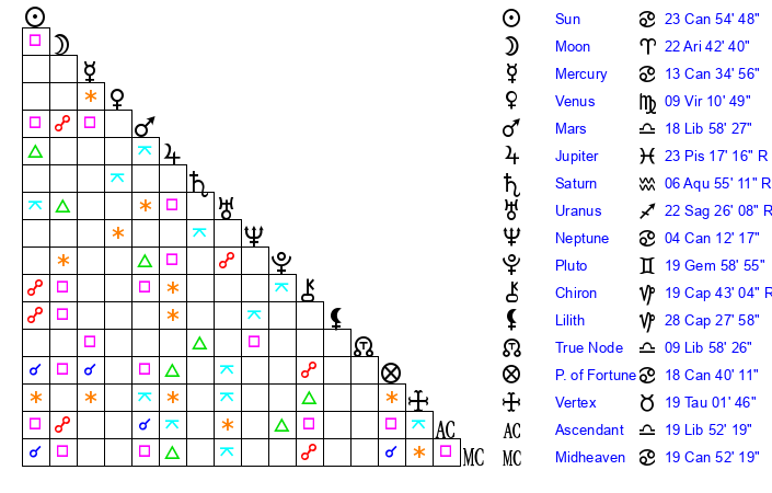 | Sun | 23 Cancer 55 | 25 Cancer 22 | 23 Scorpio 10 |