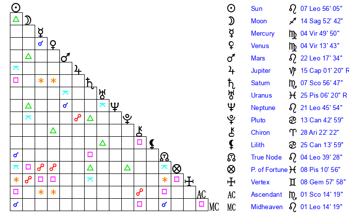 | Moon | 14 Sagittarius 51 | 29 Libra 51 | 16 Leo 34 |