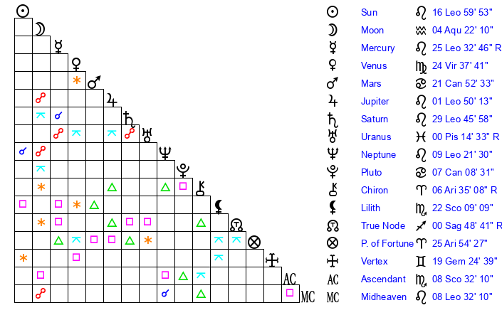 | Sun | 16 Leo 59 | 18 Leo 19 | 1 Sagittarius 22 |