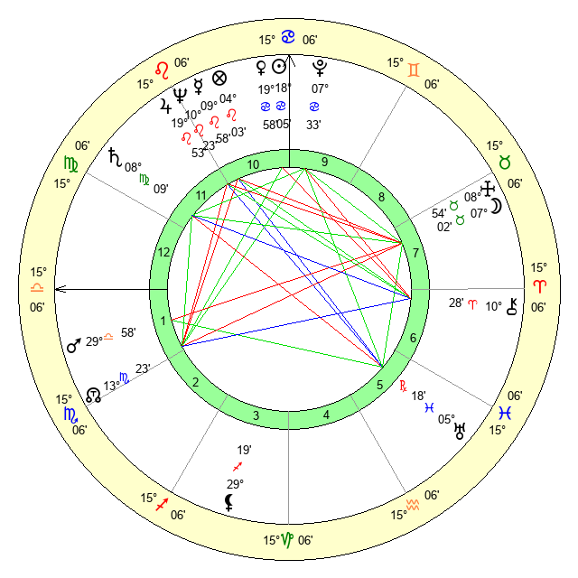 | Venus | 19 Cancer 59 | 6 Gemini 44 | 29 Scorpio 23 |
