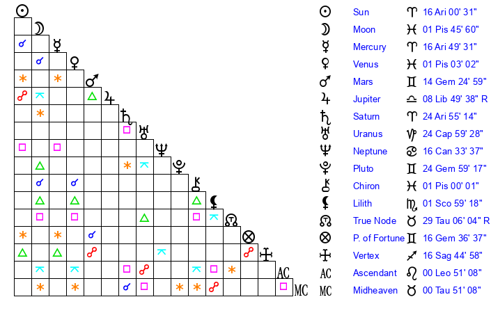 | Sun | 16 Aries 1 | 17 Aries 8 | 6 Leo 37 |