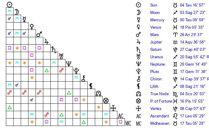 | Uranus | 20 Sagittarius 52 | 26 Taurus 1 | 17 Sagittarius 13 |