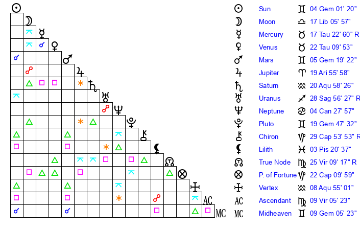 | Pluto | 19 Gemini 48 | 3 Aquarius 42 | 21 Gemini 44 |