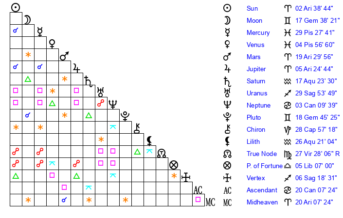 | Pluto | 18 Gemini 46 | 3 Aquarius 24 | 21 Gemini 6 |