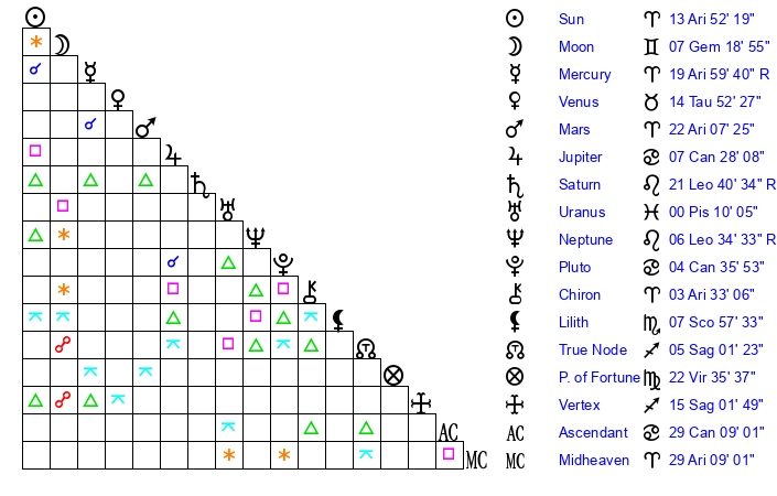 | Sun | 13 Aries 52 | 15 Aries 10 | 25 Cancer 57 |