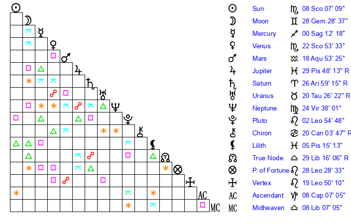| Sun | 8 Scorpio 7 | 9 Scorpio 16 | 5 Aquarius 21 |