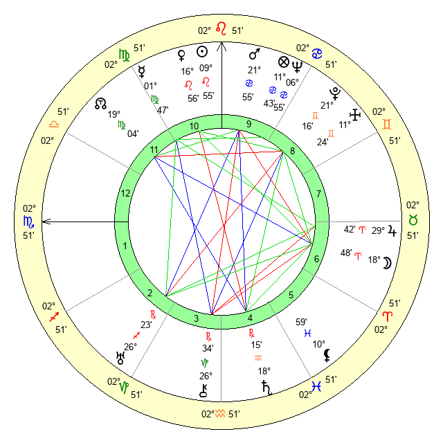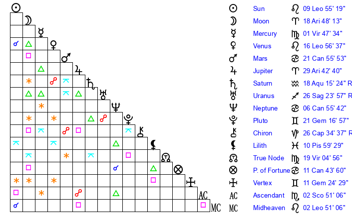 | Moon | 18 Aries 41 | 23 Scorpio 31 | 27 Virgo 19 |