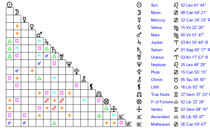 | Mercury | 22 Cancer 30 | 12 Leo 45 | 25 Scorpio 6 |