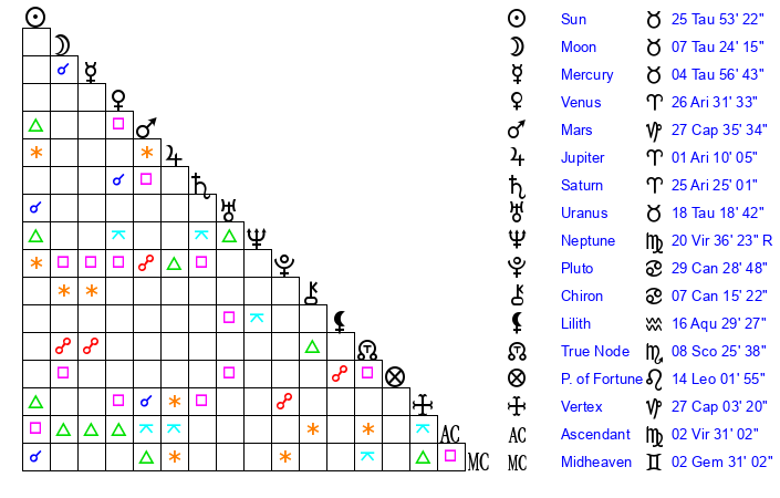 | Moon | 7 Taurus 26 | 23 Capricorn 20 | 29 Gemini 42 |