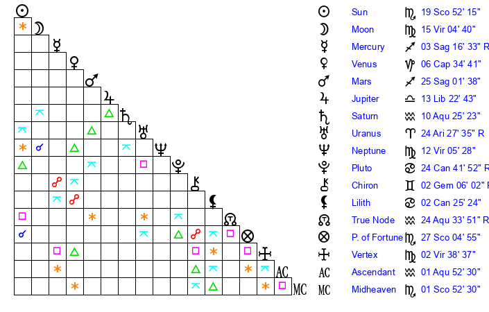 | Sun | 19 Scorpio 52 | 20 Scorpio 34 | 23 Aquarius 18 |