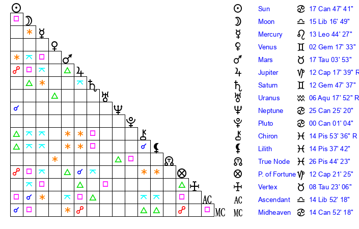 | Moon | 15 Libra 19 | 16 Capricorn 59 | 21 Scorpio 52 |
