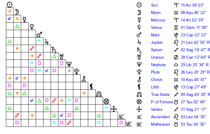 Sun | 15 Aries 38 | 15 Aries 55 | 22 Gemini 23 |