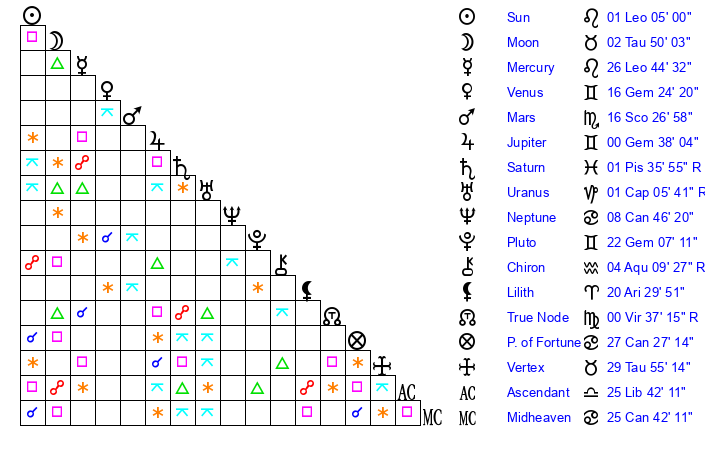 | Mercury | 26 Leo 45 | 13 Leo 53 | 19 Sagittarius 31 |