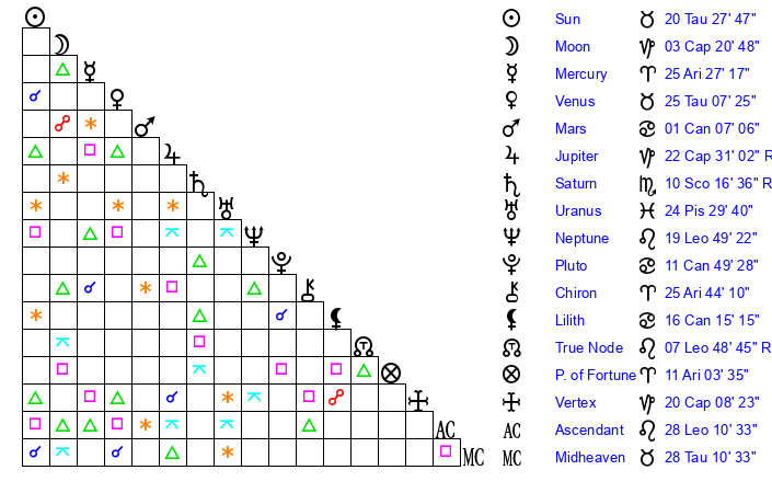 | Sun | 20 Taurus 28 | 21 Taurus 15 | 26 Leo 10 |