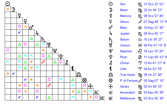 | Sun | 21 Scorpio 33 | 22 Scorpio 34 | 6 Pisces 5 |