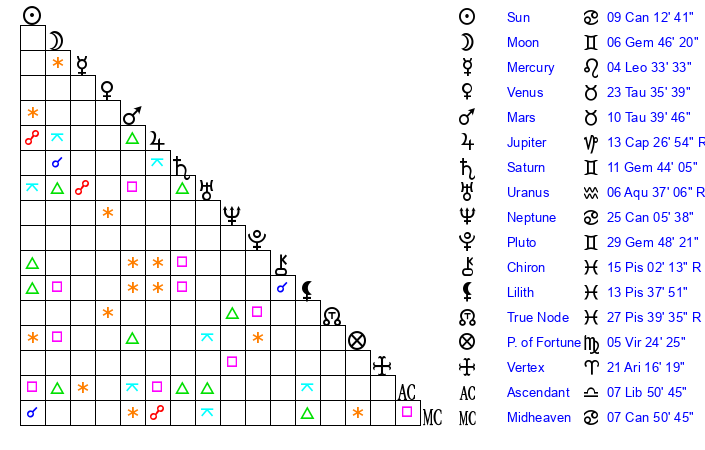 | Moon | 6 Gemini 42 | 27 Virgo 56 | 12 Cancer 5 |