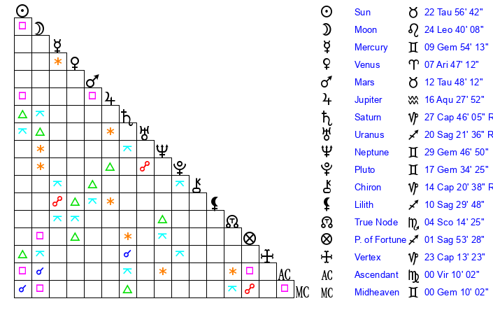 | Sun | 22 Taurus 56 | 24 Taurus 9 | 20 Virgo 55 |