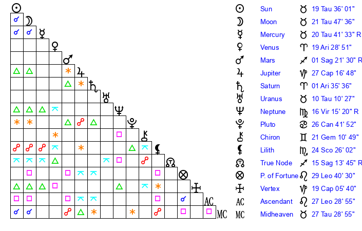 | Sun | 19 Taurus 36 | 20 Taurus 17 | 13 Leo 47 |