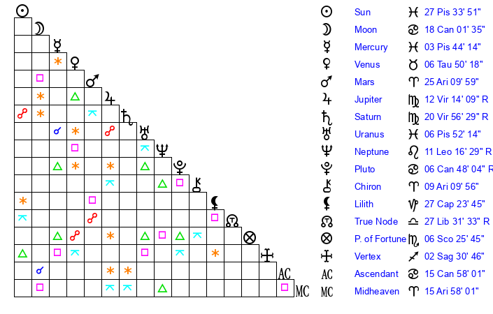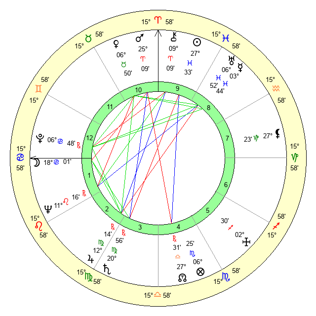 | Moon | 18 Cancer 13 | 16 Scorpio 22 | 3 Taurus 32 |